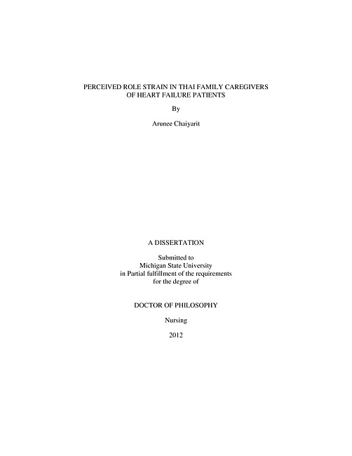 Background: Family caregivers (FCGs) of heart failure (HF) patients in rural areas in Thailand tend to experience role strain because they complete difficult and time consuming HF caregiving tasks for long periods of time. Framework: This study was guided by the Role Strain Theory (Goode, 1960). Specific Aims: The study aims were to: (1) Determine the relationship of FCG and HF patient characteristics, difficult and time consuming HF caregiving tasks, belief in the Buddhist Karma Rule, and social support to caregiver role conflict and role strain; (2) Examine the impact of difficult and time consuming HF caregiving tasks on caregiver role conflict; and (3) Test the belief in the belief in Buddhist Karma Rule and social support as possible moderating factors on the relationship between caregiver role conflict and role strain, controlling for difficult and time consuming HF caregiving tasks. Methods: This study had a cross-sectional descriptive design. The relationships among HF patient and FCG characteristics, difficult and time consuming caregiving tasks, belief in the Buddhist Karma Rule, participation in Buddhist activities, and social support on levels of caregiver role conflict and role strain were explored by conducting multiple regression procedures. The moderating effects of belief in the Buddhist Karma Rule, participation in Buddhist activities, and social support on the relationship between caregiver role conflict and role strain were tested using a general linear model. Sample: A convenience sample of 144 rural Thai FCGs of HF patients were recruited from an outpatient clinic in the Buddhasothorn Hospital of rural eastern Thailand. Results: Specific Aim 1: Caregiver gender and difficult caregiving tasks were positively correlated with caregiver role conflict (r= .267 to .664), while social support was negatively correlated with caregiver role conflict (r = -.579). Caregiver gender, difficult caregiving tasks, and social support were significant predictors of caregiver role conflict (p < .05). Caregiver gender, difficult caregiving tasks, caregiver physical function, and HF functional class had positive correlations with caregiver role strain (r = .237 to .577). Participation in Buddhist activities, and social support were negatively correlated with caregiver role strain (r = -.631 to -.710). Caregiver gender, difficult caregiving tasks, physical function, HF functional class, participation in Buddhist activities, and social support were found to be significant predictors of caregiver role strain (p < .05). Specific Aim 2: Difficult and time consuming caregiving tasks were positively correlated with role conflict (r = .577 to .664). Difficult caregiving tasks was a significant influence on role conflict (p < .000) but time consuming caregiving tasks was not significantly correlated with role conflict (p = .291). Specific Aim 3: Caregiver social support, belief in the Buddhist Karma Rule and participation in Buddhist activities were negatively correlated with caregiver role conflict and role strain (r = -.579 to -.710). Caregiver social support, belief in the Buddhist Karma Rule and participation in Buddhist activities were significant moderating factors on the relationship between caregiver role conflict and role strain (p < .05). Implications: The study results can be used to develop of evidence-based caregiver screening and support programs to evaluate, or relieve, role conflict and role strain in FCGs in order to enhance physical and psychological health. Explicit guidelines, standards, and protocols should be developed to deliver care for FCGs of HF patients and other chronically ill patients in rural Thailand. Future research should examine specific types of caregiving tasks and Buddhist activities that influence caregiver role conflict and role strain in a larger sample.