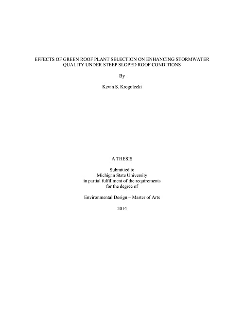 Green roofs utilize surfaces on a building to grow vegetation in some type of soil substrate. This practice is not new, but most recently, it has been used to mitigate some of the negative effects of urbanization (e.g., stormwater runoff — quality and quantity). Green roofs have been proven to reduce the total amount of stormwater runoff from roof surfaces while increasing the duration of time that runoff occurs, thus reducing peak flow for rivers in a watershed. Also, green roofs have proven to affect stormwater runoff quality, both positively and negatively. While some studies have shown that green roofs can act as a sink with respect to some pollutants in stormwater runoff, others suggest that green roofs can act as a source for other types of pollutants.In this study, experimental sloped green roof plots were constructed to monitor green roof runoff water quality versus the runoff from conventional shingle and steel roofing surfaces. As a part of the study, two green roof vegetative types (Sedum & native grass) were compared to bare media only and evaluated for storm water runoff quality. From this study, it was determined that the green roofs with vegetation will uptake more nutrients than non-vegetated roofs but few differences could be determined between vegetation types with respect to water quality runoff. Runoff from green roofs proved to be higher for both nutrients and turbidity than roofs with conventional roofing materials; it also was found that green roofs increase pH when compared to roofs with conventional roofing materials.