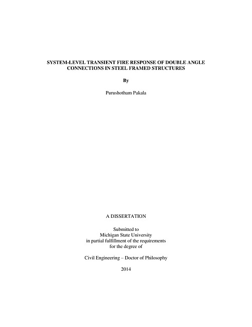 ABSTRACTSYSTEM LEVEL TRANSIENT FIRE RESPONSE OF DOUBLE ANGLE CONNECTIONS IN STEEL FRAMED STRUCTURESByPurushotham PakalaSteel framed structural systems are frequently used in high-rise buildings due to high structural performance steel provides as compared to other construction materials. In these steel framed structures, connections play a significant role in transferring forces from one member to another member and influence the overall stability of the structural system at ambient and fire conditions. Among different connection configurations available, double angle connections possess superior tying resistance and rotational capacity as compared to other relatively brittle connection types. Performance of connections under fire conditions is much more crucial to the stability of structural system as they experience rapid degradation in load carrying capacity and stiffness, due to deterioration of strength and elastic modulus of steel with temperature. The current approaches for evaluating fire resistance of connections have many limitations and do not take into consideration critical factors governing fire response. For example, connections experience significant fire induced axial restraint forces when exposed to fire and these forces are influenced by factors such as decay phase of fire, restraint to free thermal expansion imposed by the unheated structural elements adjacent to the connection. However, current design provisions do not consider the effect of fire induced restraint forces. Further, current provisions are based on results from scaled/isolated connection tests. However, the response of double angle connection at system-level is completely different from that of scaled/isolated connection behavior.The system-level fire response of double angle connections is simulated by developing finite element models using ANSYS. The finite element models account for material and geometrical nonlinearities, degradation of constitutive material properties with temperature and complex non-linear contact interactions, that have significant influence on the fire response of double angle connections. The validated models are used to carry out parametric studies to quantify the influence of critical parameters. Results from the parametric study show that fire performance of double angle connections is affected by increased load level and fire characteristics, while fire resistance gets enhanced when the presence of concrete slab in the structural frame is taken into account.To study the influence of system level interactions on the behavior of double angle connections and to validate the finite element models, fire resistances tests on two double angle connection assemblies were conducted. The test variables included load level, presence of slab, structural continuity and fire scenario. Results from fire tests show that double angle connections are highly ductile and have inherent rigidity to carry higher fire induced axial forces for which they are not typically designed for. Results from the fire tests, data from parametric studies were utilized to develop a rational methodology for evaluating the fire resistance of connections. The proposed methodology, developed based on equilibrium principles, uses temperature dependent moment-curvature-axial force (M-κ-P) relationships to trace the response of double angle connection assemblies. The proposed methodology accounts for critical factors such as fire induced axial forces, design fire scenarios, material and geometric nonlinearities.