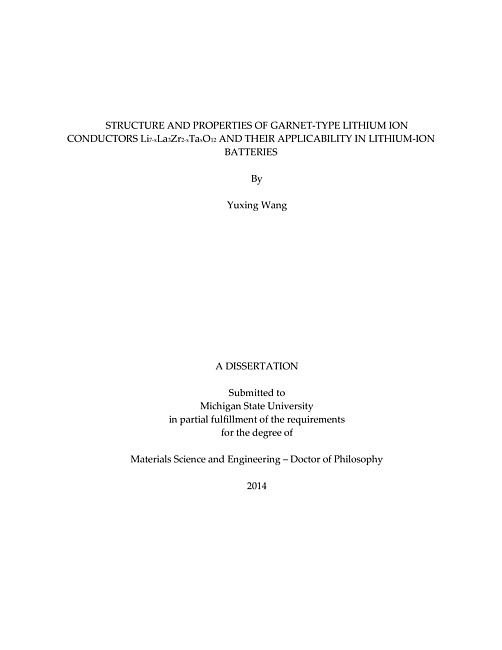 Li-ion batteries have served as the primary energy storage units in portable electronic devices and will continue to play an important role in the sustainable energy future. Despite decades of developments, the energy density and safety of Li-ion batteries still cannot live up to the increasing demands of modern society. Many issues are related to the state-of-art liquid electrolyte due to its intrinsic volatility and flammability. Solid-state lithium ionic conductors have received much attention recently and the garnet-type lithium ion conductors have emerged as the most promising candidate in the oxide system owing to their high conductivity and good chemical/thermal stability. This dissertation describes my PhD research work on the structure and properties of the garnet materials and their applicability in lithium-ion batteries.In Chapter 3, a series of garnet compounds Li7-xLa3Zr2-xTaxO12 (LLZTx, x= 0 - 2) were synthesized and their phases and transport properties were characterized. The highest bulk conductivity of 9.6 × 10-4 S/cm is achieved for the composition Li6.7La3Zr1.7Ta0.3O12 which marks the highest value reported in the literature at the time of publication. Ta5+ doping stabilizes the cubic garnet structure and the cation Ta5+ and Zr4+ form complete solid solutions for the cubic garnet compounds. A carefully conducted study of the LLZTx series reveals that pure cubic garnet phase forms only when x ≥ 0.6.To understand the transport properties of the LLZTx series, the structures of selected compositions in this series were studied by diffraction techniques and computer simulation. Neutron diffraction study provided information about the average structure whereas the pair distribution function (PDF) analysis shed light on the local structure. Atomistic simulation based on interatomic potentials was carried out and a statistical approach was employed to extract useful structural information. We found that both tetrahedral and octahedral Li display strong position disorders as visualized via nuclear density maps. The first-neighbor Li-Li interactions strongly influence the lithium distribution. PDF analysis and computer simulation results indicate that mobile Li ions hop through the tetrahedral-octahedral shared faces. Finally, the applicability of the LLZTx compounds in lithium-ion batteries was evaluated. It was found that the LLZTx compounds were stable against Li metal but unstable against moisture and CO2. The composition LLZT0.3 is more compatible with the cathode material LiCO2 than the LiFePO4. Partial success was achieved using sol-gel method. The pulsed electric current sintering was successfully applied to the densification of LLZT0.6 powder.