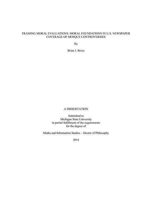 In recent years, attempts by Muslims all across the U.S. to build worship spaces have been met with opposition. Some opponents questioned whether Islam should be considered a religion afforded all the protections of the First Amendment, or whether it is a sinister ideology that posed a threat to American values and should therefore be opposed. Supporters, on the other hand, argued that protecting the rights of Muslims to worship freely is a validation of important American principles. This debate played out in news coverage of the issue.This dissertation examines the discourse in the debate through a framing analysis of news articles and editorials (n=349) from five U.S. newspapers between 2010 and 2013. Framing is the selection and emphasis of certain problem definitions, causal attributions, moral evaluations, and treatment recommendations in discussion of an issue. This research makes a contribution to framing theory by using Moral Foundations Theory to improve the operationalization of the moral evaluation dimension of framing. A cluster analysis of moral foundations was conducted, which four moral foundation profiles, all of which were strongly rooted in socially binding moral foundations. Those moral foundation variables were subsequently incorporated into a full framing analysis. A cluster analysis of all the framing components revealed five frames: Local Regulation, Political Debate, Muslim Neighbors, Islamic Threat, and Legal Authority. A subsequent qualitative analysis validated that these five frames encompassed the bulk of the debate.