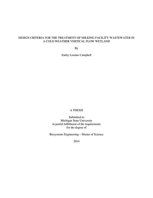 The wastewater produced by Michigan milking facilities is harmful to the environment and costly to treat. A field demonstration of a subsurface treatment wetland in mid-Michigan has had continual success and has proven the capacity of constructed wetlands to effectively and affordably treat milking facility wastewater in colder climates. However, the wetland's design was inefficient and over-sized. Data from two lab-scale wetlands were collected and analyzed in order to create sizing and design criteria for a cost-effective design.As a result, design and sizing criteria were created for two types of wash water: manure contaminated and manure free. Several types of nutrients were monitored, including phosphorus, organic matter, total nitrogen, ammonia, nitrate, and pH. Since nitrogen levels in the manure contaminated wash water was three times larger than that in the manure free wash water, different designs were needed, though both designs were successful at treatment of COD and nitrogen. Phosphorus treatment was adequate, but temporary, as the wetland media lost capacity with time. Clogging potential was also taken into consideration. Although the change in hydraulic conductivity was indiscernible in the lab wetlands, the field site, which has been in operation over five years, was examined and no sign of clogging was found in sampling.