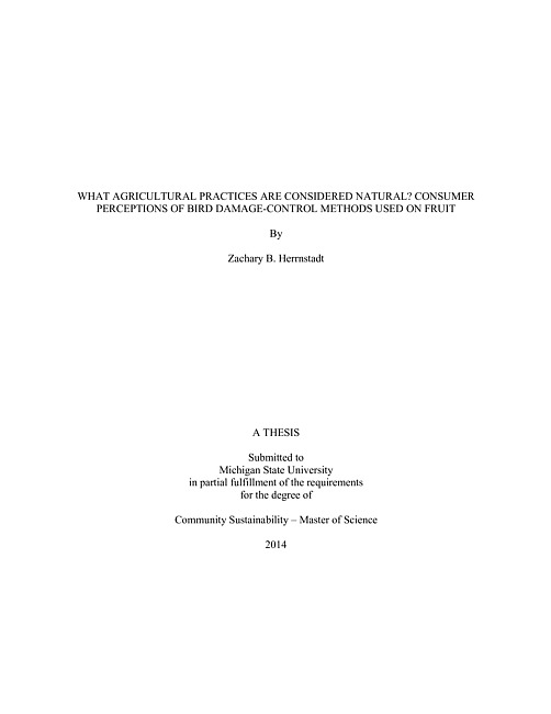 "The techniques use by farmers to mitigate bird damage to fruit crops are prime examples of agricultural methods that have the potential to influence sales, but have not been rigorously researched. Through focus groups and a nationally representative survey, this thesis explores consumer perceptions of naturalness in relation to their preferences regarding common bird damage-control methods."--From abstract.