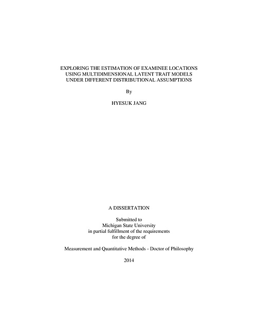 "This study aims to evaluate a multidimensional latent trait model to determine how well the model works in various empirical contexts. Contrary to the assumption of these latent trait models that the traits are normally distributed, situations in which the latent trait is not shaped with a normal distribution may occur (Sass et al, 2008; Woods & Thissen, 2006). As a result when studies construct evaluations or comparisons in order to determine the appropriate estimation method and to avoid inefficient ones, the distribution or distributional statistics of the latent trait are considered as a key assumption. This study explores the performance of parameter estimation using a bifactor model, a type of multidimensional latent trait model in order to provide information of the effects of violations of the distributional assumptions... " -- Abstract.