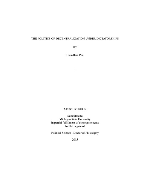 In this dissertation, I argue that dictators face two principal-agent problems of defection and compliance when they find themselves in the dilemma of empowering local elites via decentralization. On one hand, dictators wish to sufficiently empower local elites that they can deliver effective and efficient governance tailored to local needs. On the other hand, dictators do not wish to empower local elites too much so that they are capable of imposing threats on the political survival of authoritarian rule. Thus, dictators (principal) have to face two principal-agent problems in the management of local elites (agent). First, dictators face the problem of defection if unsatisfied local elites’ governing apparatus switch to aid opposition forces conditional on the party system. The dual installation of decentralization and party system decides if the collision of unsatisfied local elites (insider) with opposition elites (outsider) is incentivized in the equation of regime revision. Second, the problem of compliance refers to the local elites’ violation of central policy. Elected local elites are motivated to over-commit to international investors so that they fail to comply with central policies of maintain credibility in bilateral investment treaties. The two problems are derived from the lack of an ultimate authority to define, interpret and settle disputes between central and local governments under dictatorship. Using statistical models, I explain why some decentralized dictatorships are more resistant to authoritarian breakdown as decentralization is simultaneously installed with single party system; I also ask how decentralization influences authoritarian credulity in bilateral investment treaties that central government signs with foreign countries. I find that decentralization facilitates the signing of BITs in the case of China, but hurts the maintenance of them in dictatorships. Local elites are strategic players in the problem of defection and compliance. The findings are expected to shed light on the literature of political institutions, democratization and international cooperation for authoritarian rule. As the literature of political institutions under authoritarian regime applauds the institutional effect on the political survival of dictatorship, the combined effect of institutions are left out of discussion. Chapter 2 makes a small step forward in this regard. In addition, the linkage between the literature of political institution and international cooperation is of consequence to global order as more and more dictatorships are engaged in international institutions.