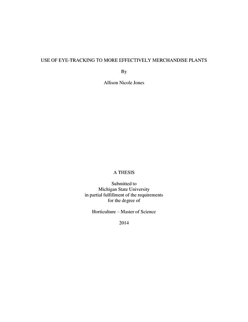 USE OF EYE-TRACKING TO MORE EFFECTIVELY MERCHANDISE PLANTSBy Allison Nicole JonesMaking the process of shopping easier or more enjoyable may bring positive benefits to both the shopper and the retailer. We used an eye-tracking device to investigate and execute two studies related to consumers' use of visual cues (signs) in retail garden center displays. In the first study we focused on informational signs that described that the plants were grown using water conservation practices and separate survey questions about their water conservation practices. From this study we found that attention to the sign communicating water conservation production practices was linked to participants' home water conservation practices. Participants who were more likely to conserve water on their plants at home were also more likely to purchase plants that were grown under water saving practices than those participants that were not as likely to conserve water. Participants from Florida seemed to be more sensitive to water conservation signage than participants from non-drought areas such as Michigan and Indiana. The second study focused on consumers viewing of informational signs that described vegetable and herb transplants grown under sustainable production practices. From this study we were able to show differences in participants' weekly purchases of organic products and its relationship to first fixation duration (FFD) on the informational sign. Participants who spent a larger amount of their weekly budget on organic products had a longer FFD on the sign. Differences between participants who had children under the age of 18 in their household compared to participants who had no children in their household were also found.