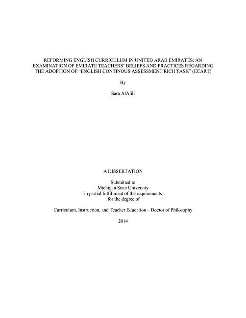 Reforming English curriculum in United Arab Emirates : an examination of Emirate teachers' beliefs and practices regarding the adoption of "English Continous Assessment Rich Task" (ECART)