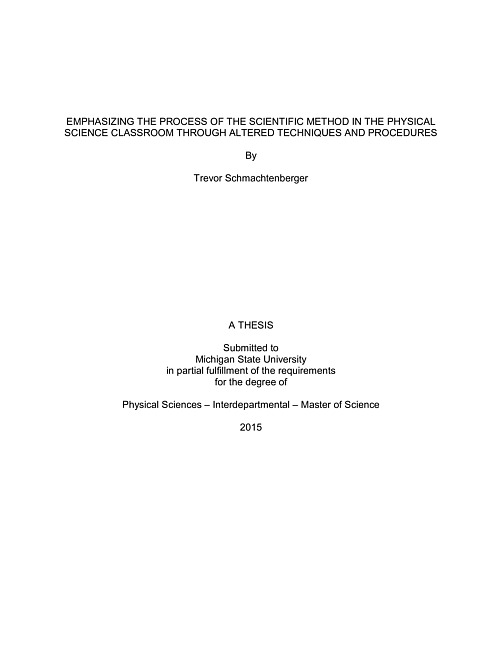 ABSTRACTEMPHASIZING THE PROCESS OF THE SCIENTIFIC METHOD IN THE PHYSICAL SCIENCE CLASSROOM ByTrevor Schmachtenberger High school science requires students to use the scientific method when solving problems. The ability to solve problems in this way is a valuable and necessary skill for the classroom and life experiences. The goal of this study was to fully incorporate scientific thinking and methodology into the current curriculum. The hypothesis for this study was: a gradual release of responsibility from instructor to student will show an improvement in the ability of students to solve critical thinking problems, an integral part of the scientific method. This project was implemented over the period of one semester, 18 weeks and covered eight units of study. The research reported here focused on three particular units: Motion, Heat Energy, and Wave Energy. Students in a Physical Science class participated in making observations, identifying patterns, and asking questions based on the observed patterns, which led to student developed hypotheses and protocols, including data collection and analysis. Students participated in their own scientific practices, which, in turn, led to a sense of ownership and also a more thorough understanding of the scientific method and its practices as measured by lab activity accuracy and improvement in formative scores. Pre-test and post-test results indicated an improvement in students’ ability to use scientific methodology.
