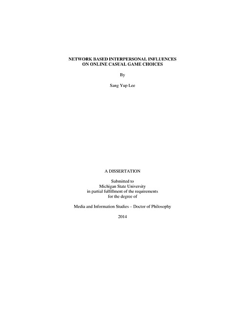 Using empirical data on players' game choices and gaming behaviors and their relationships and interactions with other players on an online casual games portal site, Kongregate, I conduct three separate but complementary studies of ways in which other players may influence a player's game choices and gaming behavior. First, I examine whether a game player's game choice is influenced by other players with whom the player has direct connections and interacts on Kongregate. On Kongregate, a player is said to be have a direct connection with another player if she forms a connection with the other player by clicking the `friend' button linked to the latter. Once a player has established a direct connection with a second Kongregate player, then the first player can initiate a chat with the second player via a dedicated communication channel between them and the first player receives information such as what games the other player is playing and has played. I also study how the influence of other players with whom a player has direct connections on Kongregate on the player's game choices varies with the closeness of the connections between the player and those other players. In this dissertation, the closeness of the connection between two people refers to the strength of the tie (relationship) between them. The strength of a tie between two people is a function of the amount of time, the emotional intensity, the intimacy, and the reciprocal services that characterize the tie between those two people (Granovetter, 1973, p1361). According to the theory of planned behavior and several studies of peer influence (e.g., Garnier & Stein, 2002; Maxwell, 2002; Thornberry & Krohn, 1997), an individual's behavior is more likely to be influenced by someone close than others.Second, I examine the importance of certain the homophily and social influence processes in the formation of relationships among friends on Kongregate and changes in their gaming behaviors, focusing on game genre preferences and gaming frequency. The homophily principle says that a person is more likely to be friends with others who are similar to herself than others who are dissimilar (Steglich et al., 2006). This suggests that a game player is more likely to be friends with other players who have similar gaming characteristics than others who do not. On the other hand, social influence process refers to a phenomenon in which an individual's behavior is likely to become more similar to that of her friends over time (Steglich et al., 2006), which suggests that a game player's gaming behavior will become similar to that of her friends over time. Third, I examine players' game choices to see if they exhibit patterns consistent with a choice bandwagon and the influence traditionally ascribed to word-of-mouth. This study looks for evidence that the number of times a game is consumed on a day is influenced by the number of times the game has been consumed previously and by what game players say about the game in posts on Kongregate. In addition, I also examine how the location where information about a game is displayed on the portal site influences the number of times the game is consumed on a given day, and how the effects of word-of-mouth information and the number of times a game has been consumed previously on the number of times the game is consumed on a day vary with where information about the game is displayed on the siteThis dissertation consists of five separate chapters including this introductory chapter. Each of the three studies described above is examined in a separate chapter, from Chapter 2 through 4. The last chapter concludes the dissertation by discussing how the present study can be improved or extended and by identifying important questions, which have not been addressed in this study, that might be examined in the future studies.