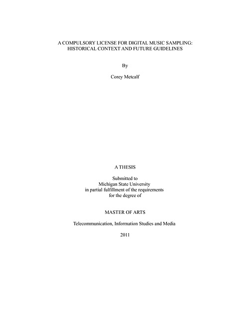 ABSTRACTA COMPULSORY LICENSE FOR DIGITAL MUSIC SAMPLING:HISTORICAL CONTEXT AND FUTURE GUIDELINESByCorey MetcalfOver the past three decades, digital music sampling has become a cornerstone of modern music production, and is reflective of a larger movement towards collage and re-appropriation across the arts.Despite this fact, the legal paradigm surrounding the clearance of samples remains full of inefficiencies and unfairness, with unnecessarily high transaction costs on both sides of the sale, and some potential purchasers of licenses being shut out completely. The option of a compulsory license has been used to solve similar problems in many areas of intellectual property, including mechanical licenses in the area of music itself. This paper looks at the legal, economic, technological, and creative history of digitalmusic sampling and argues that the creation of a compulsory license for sampling would be a worthwhile endeavor, ultimately benefitting the three most important stakeholders in sampling: the party being sampled, the party doing the sampling, and the audience for sample-based music. In the final chapters, guidelines for how such a license might look are presented, and the actual process for how a compulsory license might be created is explored.