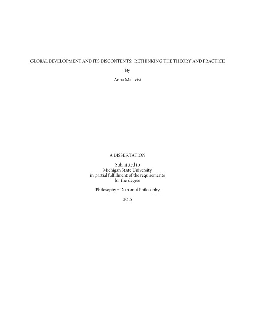 ABSTRACT GLOBAL DEVELOPMENT AND ITS DISCONTENTS: RETHINKING THE THEORY AND PRACTICEByAnna Malavisi Global development is comprised of a system of ideas, policies, institutions and individuals all concerned with the amelioration of the living conditions of those populations living in disadvantaged conditions. According to the Universal Declaration of Human Rights Article 25, Everyone has the right to a standard of living adequate for the health and well-being of himself and of his family, including food, clothing, housing and medical care and Article 22, Everyone is entitled to a social and international order in which the rights and freedoms set forth in this Declaration can be fully realized. So, in a way the system of global development has been set up as a way to respond to these two human rights, first to provide all children, women and men with the fulfillment of basic necessities and second to ensure that the social and international order responds appropriately. However, in the reality this is not so. I argue that if we are really serious about the impact of global development, then this requires a rethinking of the theory and practice. Despite efforts made to contribute to the amelioration of people's lives in the name of development, human development indicators continue to be alarming: more than a billion people are malnourished, 884 million people do not have access to clean water, basic sanitation is denied to 2.5 billion people and 774 million people cannot read and write. Although the causes of these evident deprivations are not entirely due to development, it could be argued that due to the ineffectiveness of development these situations are not adequately addressed. Some of the problems particular to development include the implementation of inappropriate projects and programs; the dynamics of relationships between the multiple actors who play a role in development often entrenched in power and domination; and poor mechanisms of accountability. This has resulted in trillions of dollars invested in the name of development, but I would argue with poor results. In my dissertation I offer a more in-depth analysis and understanding of the current development paradigm, its theory and practice. There are two fundamental problems in development. First, there is a rather token and weak presence of an ethical dimension and second, the suppression of knowledge or what Boaventura de Sousa Santos calls, "a form of epistemicide." There is another dimension to the way the global north has imposed a capitalist and imperial order on the global south that is often missed or blatantly ignored. This is epistemological. Therefore, I argue that implementing a strong ethical approach to development and understanding epistemic injustice in development will help to respond to severe global problems such as poverty and hunger in a different way. I particularly focus on neglected tropical diseases (NTD), a group of tropical diseases that occur all over the world but are markedly absent from the affluent countries. Using the example of NTD, I analyze how current development paradigms and approaches fail to address gross injustices such as the health disparities in the treatment and cure of these diseases. My ultimate aim is to offer an analysis of the problem of NTD from a development ethics perspective which intersects with feminist epistemology. From my own analysis which also draws on my experience, I venture to argue that one of the fundamental problems of development theory and practice is grounded in theoretical discussions of knowledge, and how this knowledge is then applied in the practice. First, I introduce an interpretation of global development from a theoretical standpoint as well as its practice. Second, I analyse the situation of NTD, and particularly Chagas Disease as a consequence of the failings of development. Third, I argue for a strong ethical approach in development and propose what a strong ethical approach should entail. Fourth, I discuss the notion of epistemic injustice in global development. Lastly, I offer some recommendations for the practice of development based on a strong ethical approach and epistemic justice.