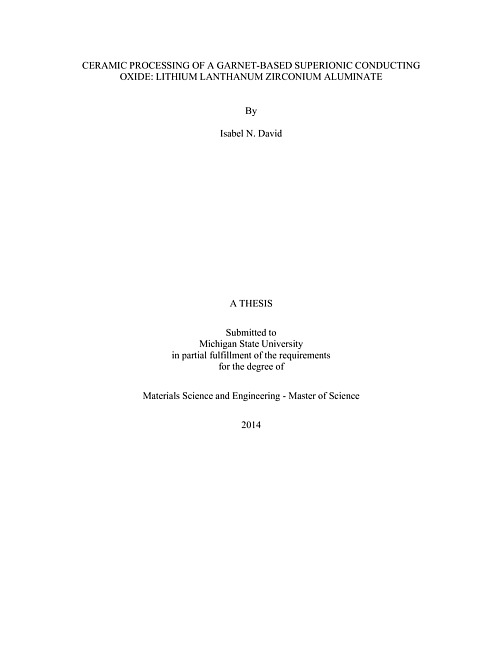 Ceramic processing of a garnet-based superionic conducting oxide : lithium lanthanum zirconium aluminate