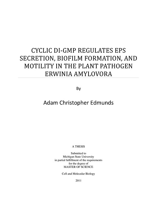 The second messenger cyclic di-GMP (c-di-GMP) is a nearly ubiquitous intracellular signal molecule known to regulate various cellular processes including biofilm formation, motility, and virulence. This intracellular concentration of this molecule is inversely governed by GGDEF-containing proteins (GCPs) and EAL-containing proteins (ECPs), which synthesize and degrade c-di-GMP, respectively. The role of this regulatory molecule in the plant pathogen and causal agent of fire blight disease, Erwinia amylovora was explored. In this study, it is demonstrated that E. amylovora contains three functional diguanylate cyclases (DGCs) that synthesize c-di-GMP: gcp1, gcp3, and gcp5; and two functional c-di-GMP specific phosophodiesterases (PDEs) that degrade c-di-GMP: ecp1 and ecp3. C-di-GMP was not detected in the wild type strain. C-di-GMP was shown to positively regulate biofilm formation and secretion of the main expolysaccharide amylovoran and to inversely regulate swimming motility and virulence. A deletion of ecp3 resulted in a hyper-biofilm forming phenotype. Interestingly, over-expression of dgc1, which contains both an EAL and a GGDEF domain, resulted in no observable phenotypic differences from the wild type strain, even though over-expression of dgc1 increased the levels of c-di-GMP.