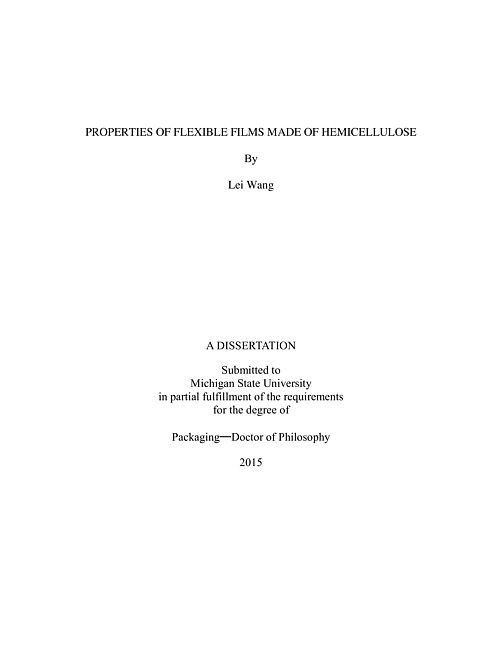 Hemicellulose is the second most abundant component of plant cell walls after cellulose. It has received increasing interest as an alternative to petroleum based polymers for packaging applications because of its abundance, renewability and biodegradability. However, there are some challenges in the utilization of hemicellulose as a packaging material. Hemicelluloses are complex heteropolysaccharides with varied compositions and structures depending on the hemicellulose source (e.g., plant species, location and growth stage); they can also be influenced by the chemical, physical and biological isolation processes used to isolate them, and by any pretreatment used before isolation. It is critical to understand the influence of these factors (hemicellulose source, isolation approach, and pretreatment) on the final hemicellulose properties, such as mechanical and barrier properties, which are important for packaging applications. In addition, pure hemicellulose obtained from plants is water sensitive, brittle and weak, making it unsuitable for most packaging applications even though it is a good barrier for oxygen. Modification of hemicellulose is needed to meet the requirements of packaging materials such as protection against chemical, mechanical, physical and biological damage, and good barrier against water, oxygen, odors, etc.This research focuses on the fabrication and characterization of hemicellulose based films with adequate properties to enable their potential application as packaging materials. Three types of raw materials, aspen ChemiThermoMechanical Pulp (CTMP), spruce CTMP and hybrid poplar powder, with different pretreatments (bleaching and no bleaching) were employed to obtain hemicelluloses by an alkaline extraction method. The extracted hemicellulose was further formed into film by solvent casting in water with the addition of sorbitol and glutaraldehyde. These two chemicals were used as a plasticizer and a cross-linking agent, respectively, to improve the properties of hemicellulose films.Mechanical and barrier properties of the hemicellulose based films were determined. Hemicellulose sources and pretreatments played an important role in the properties of hemicellulose based films. Hemicellulose based films from less treatment (powder samples, no bleaching) displayed better properties than the films from more treatment (pulp samples, bleaching) in general. Hemicellulose based films prepared from hybrid poplar powder without bleaching exhibited the highest tensile strength (76.5 ± 7.0 MPa) and elongation at break (5.4 ± 0.9%), which were higher than the values obtained from other studies of similar hemicellulose based films. Glutaraldehyde was suggested to be responsible for this improvement. The modulus of elasticity (MOE) (3.5 ± 0.4 GPa) was comparable with those obtained for similar hemicellulose based films in other studies. The differences in molecular weight, lignin content and crystallinity for the hemicellulose film obtained from different approaches were believed to result in the differences in tensile properties. No significant improvement in the barrier properties (water vapor and oxygen barrier properties) of the hemicellulose based films was observed in this study, which is similar to the results obtained in other studies. Hemicellulose based films prepared from both unbleached spruce CTMP and hybrid poplar powder had better barrier properties than the other films as indicated by the lower water vapor transmission rate (WVTR) values obtained at 23 °C and 100% RH, but not as good as most current commercial packaging films whose WVTR values were several orders of magnitude lower.
