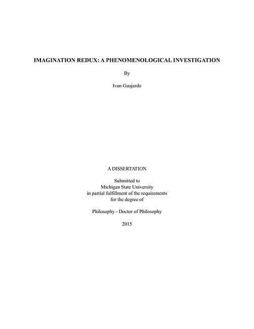 ABSTRACTIMAGINATION REDUX: A PHENOMENOLOGICAL INVESTIGATIONBYIvan Guajardo The imagination has been enjoying an increase in popularity in recent years. Research on it now ranges from empirical studies of mental imagery to philosophical attempts to classify it. Although this research has generated valuable insights, most of it fails to pay sufficient attention to our intentional experience of imagination. As a result, misconceptions of imagination abound, and dimensions of our lived experience of it that are central to describe its nature adequately are often overlooked or treated very superficially. In what follows, I revisit the phenomenon of imagination and develop a better account of its intentional structure. On the basis of Husserl's writings, I will argue that imagination is a distinctive psychic act that differs from perception and memory in terms of its quasi-positional stance on objects, its freedom to alter pure possibilities at will, and in terms of how imagine objects relate to time. After developing a phenomenological description of these three essential differences, I describe three forms of imagination, and then use everything learned as the basis of an argument against pictorialism, an alternative theory that reduces imagination to a mere ability to form mental images. I will argue that, despite its influence, pictorialism misconceives what it is like to imagine something primarily by conflating the act of imagination with image-consciousness.