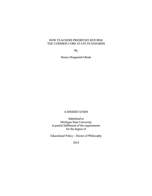 Administrators, teachers, parents, and students are familiar with policy and reform changes in the United States' educational system. Our nation is well-known for frequently adopting and implementing new reforms, especially in the core subjects of English, history, mathematics, and science (The National Academy of Education, 2009). Teachers are major catalysts for reform implementation and change within schools, largely because they will ultimately be responsible for implementing their ideas in the classroom (Smith & Southerland, 2007). Teachers implement and structure the curriculum in a fashion that could either benefit or detract from the intended reform. With this in mind, the goal of this dissertation is to understand how teachers prioritize reforms. I use the example of the Common Core State Standards in mathematics to illustrate how teachers understand and interpret reform.A mixed-methods study to address the following research questions: (1) How do teachers prioritize reform? and (2) How do teachers prioritize reform related to the Common Core State Standards in mathematics? Phase I used a qualitative approach, and Phase II used a quantitative approach. In Phase I, I addressed my first research question by conducting interviews with every fourth grade teacher in one district in the Midwest. In Phase II, I addressed my second research question by conducting 400 teacher surveys in three states: Illinois, Indiana, and Michigan.