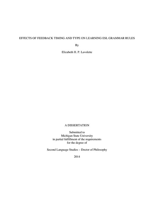 The optimal timing of feedback on formative assessments is an open question, with the cognitive processing window theory (Doughty, 2001) underlying the interaction approach suggesting that immediate feedback may be most beneficial for language acquisition (e.g., Gass, 2010; Polio, 2012) and two educational psychology hypotheses conversely suggesting that delayed feedback may be superior for error correction (dual-trace hypothesis, Kulik & Kulik, 1988; interference-perseveration hypothesis, Kulhavy & Anderson, 1972). To explore the effects of varied feedback timing on both item learning and rule generalization, 118 intermediate ESL students were randomly assigned to item-by-item or end-of-test computerized feedback conditions. Within each timing group, half of the students received feedback that indicated the correct answer and whether they had answered correctly or incorrectly (without metalinguistic feedback). The other students received additional feedback that stated a rule that applied to the item (metalinguistic feedback). A pretest, two treatments, a 5-minute-delayed posttest, and a 1-week-delayed posttest were administered. Each treatment contained 17 multiple-choice items that were followed by item-by-item or end-of-test feedback. The pretest and both posttests included all items from the treatment (to test item learning) plus 10 new multiple-choice items to test generalization of rules. The data were analyzed using mixed-design ANOVAs.The item-by-item metalinguistic feedback group had higher gain scores than the other feedback groups on the treatment items on both posttests, although no significant main effects were found for either feedback timing or type. This suggests that item-by-item metalinguistic feedback is better for item learning. On the items that did not appear on the treatment, the item-by-item groups outperformed the end-of-test groups, with a marginally significant main effect of feedback timing, F(1, 108) = 3.61, p = .06, η2part = .032. This suggests that item-by-item feedback may be better for learning to generalize. In addition, the groups that received item-by-item feedback spent significantly less time reading the feedback than did the groups who received end-of-test feedback, F(1, 108) = 4.14, p = .044, η2part = .037. These combined results suggest that item-by-item metalinguistic feedback may be more effective and efficient for language learners for both item learning and learning to generalize, although the small effects sizes indicate that providing this type and timing of feedback should be only one of many interventions to improve instruction. In addition, these results lend support to the cognitive processing window theory and attention-based theory underlying the interaction approach.