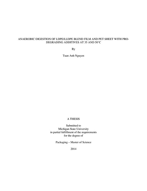 Low density polyethylene/linear low density polyethylene blend film and polyethylene terephthalate sheet incorporated with pro-degrading additives from Symphony Environmental Ltd., Wells Plastics Ltd., and EcoLogic LLC were evaluated in an anaerobic digestion environment for 16 months together with negative (blank) and positive controls (cellulose) in general accordance with ASTM D5526-12. Total biogas production of cellulose was significantly higher than that of the remaining samples. Total biogas production of samples containing plastics and the negative control were not significantly different from each other. Pro-degrading additives tested in the study did not increase the biodegradation of these plastic materials.