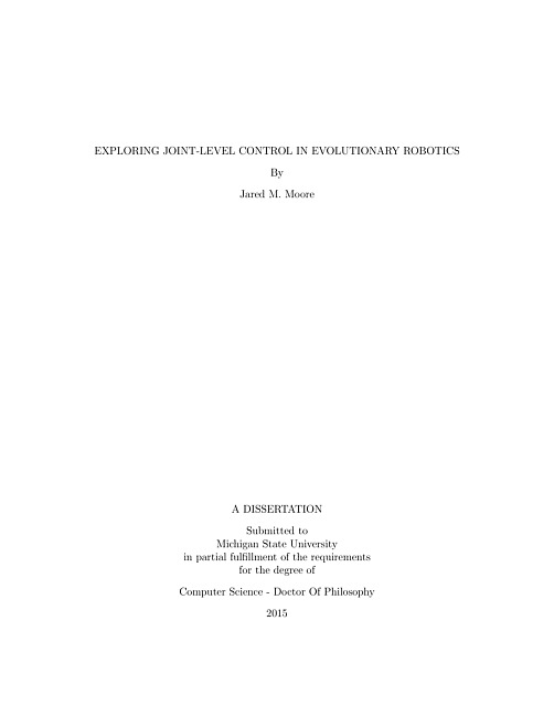 "In this dissertation, we use computational evolution and physics simulations to explore both control and morphology in robotic systems. Specifically we investigate joint-level control strategies and their interaction with morphological elements." - Abstract.