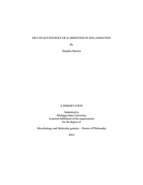 The overall goal of the study is to understand the role of β-arrestins (intracellular scaffolding cell signaling proteins) in inflammation and pathogenesis of sepsis and colitis using mouse models. Using polymicrobial sepsis model, we have demonstrated that both β-arrestin (β-arr) 1 and 2 are critical negative regulators of sepsis-induced inflammation. Inspite of major emphasis on the role of β-arrestins in immune cells, we found that the negative regulatory role of β-arr1 in sepsis-induced inflammation is infact, mediated by its function in the non-hematopoietic compartment. Having demonstrated that β-arr1 aggravated colitis in response to chemically induced colitis models, we further examined the role of β-arrestin2 in gut inflammation. Absence of β-arr2 caused greater extent of intestinal inflammation even in the absence of any exogenous stimuli. Further, T cells from peripheral lymphoid organs in β-arr2 knockout mice had dysregulated activation potential. Consequently, in the dextran sodium sulfate (DSS) model of colitis, β-arr2 knockout mice exhibited significantly higher indices of colitis compared to wild type (WT) mice. Additionally, T cells deficient in β-arr2 displayed altered T cell differentiation pattern with higher Th1 and lower regulatory T cell (Treg) polarization potential. As a result, the colitogenic potential of T cells deficient in β-arr2 as assessed in RAG T cell transfer model of colitis was found to be higher. The systemic wasting disease response though was ameliorated in RAG mice reconstituted with T cells lacking β-arr2, suggesting distinct role for β-arr2 at the active site of microbial interaction (gut) and systemic sites where the response is perhaps initiated by different ligands. Nevertheless, these results demonstrate inhibitory role for β-arr2 in T cell activation, providing protection against overt intestinal inflammation. Our studies therefore suggest cell type specific role for β-arrestins in regulating inflammation that is highly context dependent and further work on discerning the involved molecular mechanisms will likely lead to therapeutic strategies to target β-arrestins in inflammation.