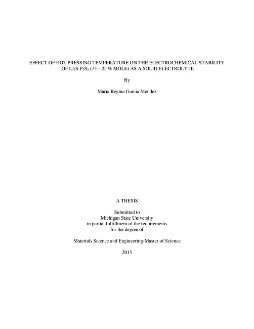 Solid state batteries can contribute to a more sustainable energy future providing the energy required when needed. It can facilitate the integration of renewable energy into the electrical grid and can provide the energy density required to make electric vehicles a massive technology without greenhouse emissions in operating conditions. To concretize the latter, high-performance electrolytes are necessary. Li2S-P2S5 (75-25% mole) is a promising solid-electrolyte that could potentially be used for this purpose. Its most appealing features include: high ionic conductivity at room temperature (~10-3 S/cm), low-temperature processing conditions, and low cost. Most likely, Li2S-P2S5 (75-25% mole) would be integrated in a battery system using Li metal as an anode. Therefore, its stability against metallic lithium must be understood. The purpose of this work is to characterize the effect of Li2S-P2S5 (75-25% mole) processing conditions, most specifically hot pressing, and their effect on Li stability. It was found that improvements on electrochemical performance can be attained by promoting particle chemistry during hot pressing.