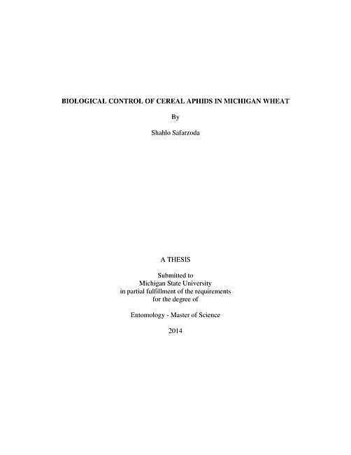 Cereal aphids (Hemiptera Aphididae) are important pests of wheat and can cause yield loss through both direct feeding injury and indirectly by transmitting viruses. Previous work has demonstrated that natural enemies are effective in suppressing cereal aphids in wheat fields in Europe and North America; however, no studies have been done in Michigan. The objectives of this thesis research were to characterize the natural enemy community in wheat fields and evaluate the role of different natural enemy groups in regulating cereal aphid population growth. I investigated these objectives in four winter wheat fields on the Michigan State University campus farm in East Lansing, Michigan. I monitored and measured the impact of natural enemies by experimentally excluding or allowing their access to wheat plants infested with cereal aphids. I found that the natural enemy community in the wheat fields consisted mostly of foliar-foraging and ground-dwelling predators with relatively few parasitiods. In combination, these natural enemy groups were very effective at reducing cereal aphid population. I also investigate the role of each natural enemy feeding guild (foliar-foraging versus ground-dwelling predators) independently. The result illustrates that ground-dwelling predators were more effective at suppressing cereal aphid populations than foliar-foraging predators in wheat fields. Overall, my research demonstrates the importance of biological control in in wheat and suggests that effective conservation of natural enemy communities can protect wheat from direct damaged caused by cereal aphids.