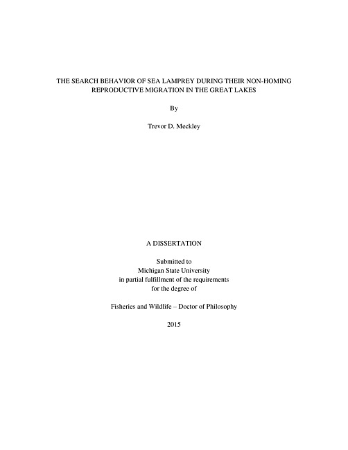 Non-homing organisms are thought to rely on stable geophysical features (e.g., land-slope), and encounter with distinct attributes of the environment (e.g., landmarks) in a predicable sequence to locate reproductive habitat (e.g., rivers always occur on a coastline). However little is known about how non-homing fishes complete a large-scale migration, as most research has focused on homing fishes that rely on geomagnetic cues to return to a natal spawning site. The invasive sea lamprey offers insight into non-homing migration, as individuals complete a single non-homing migration to rivers following translocation by host fishes in the Great Lakes. In this dissertation, Chapters 2 and 3, are devoted to developing a framework for describing animal behavior from telemetered observations and development of a standardized approach for assessing and filtering VEMCO Positioning System (VPS) data based on an estimate of horizontal position precision (HPE). This methodology was imperative for exploration of the sea lamprey migration with the underwater VPS telemetry technology.In Chapter 3, we described how sea lamprey orient to a coast when in a lake and hypothesized that sea lamprey navigate to the nearest coast by (1) orienting to the local bathymetric gradient and (2) maintain straight movements counter to the local slope to move towards shallow water. Three-dimensional (3-D) paths of migrating female sea lamprey were obtained by an acoustic array with 3 km2 of coverage, centered 3.3 km from the coast in Lake Huron. The findings of this chapter indicate that sea lamprey sampled an area of lake-bottom to assess absolute hydrostatic pressure and to select a heading towards reducing pressure (shallower water). In contrast to natal homing migrations, the sea lamprey appears consistent with non-homing orientation to a general region with a simple set of rules based on local topography.Chapter 4 focused on the sea lamprey migration along a coastline and near a river mouth. Upon reaching a coastline, sea lampreys move parallel to shore. Prior studies indicated the presence of larval odor in river water increased the likelihood that a migrant entered a river. However, it was not known whether larval odor played a role in navigation (guiding the migrant to the river mouth) or mediated habitat selection by labeling the suitability of a river for spawning. In a two-year study using a 2 km2 acoustic array, the 3-D paths of sea lamprey were documented as they approached, entered, or bypassed the Ocqueoc River in northern Michigan, under one of two conditions: (1) low larval odor; and, (2) higher larval odor, created by increased larval abundance plus the addition of the synthetic larval odor components, petromyzonamine disulfate (PADS), petromyzosterol disulfate (PSDS), and petromyzonol sulfate (PZS) to a 1 x 10 -12 M concentration. A coupled hydrodynamic and dye concentration model predicted the hydraulic conditions experienced by each sea lamprey by estimating water conditions (velocity, temperature, etc.) at each fish position and allowed for assignment of whether a position was inside or outside of the Ocqueoc River plume. Encounter with river water appears to trigger localized search, regardless of larval odor content. However, when larval odor was abundant, the migrant was more likely to enter the river. Whether a migrant enters a river, is modulated by the presence of detectable larval odor, manipulation of river selection by invasive sea lamprey for management is viable in rivers with high encounter rates. Finally, Chapter 5 covers the implications for how altering migration routes in the sea lamprey via the application of synthesized pheromones contained in larval odor could be profitable for management.