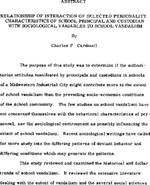 Relationship of interaction of selected personality characteristics of school principal and custodian with sociological variables to school vandalism