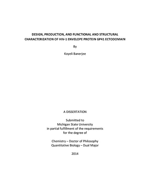 HIV is an enveloped virus which causes acquired immune deficiency syndrome in humans. HIV infects the host T-cells and macrophages and deteriorates the whole immune system. The virus initiates the infection process by membrane fusion of the viral and host cell by the membrane protein gp160. Gp160 forms a trimer structure with each gp160 molecule comprising two non-covalently bonded subunit - gp120 and gp41. Gp120 binds to the host cell receptors and coreceptors, undergoes conformational change and moves away to expose gp41. The fusion between the viral and host cell membranes is catalyzed by the ectodomain of the gp41 protein. A large number of antibody binding sites are located in the gp120 and gp41 sequence. Also, gp120 and gp41 are capable of eliciting neutralizing antibodies in vivo. However, there are a large number of drawbacks for the neutralization of the HIV - (a) fast mutation of HIV strains to evade immune response, (b) non-exposure of most of the antibody epitope regions due to heavy glycosylation, and (c) non-neutralization of a broad range of HIV strains due to mutation. Due to these difficulties, there is no vaccine for HIV developed yet.My research work focused on production of large gp41 ectodomain constructs and biophysical and structural characterization. The N-terminal fusion peptide (FP) and C-terminal membrane proximal external region (MPER) are critical for fusion and are postulated to bind to the host cell and HIV membranes, respectively. One significant finding was observation of synergy between the N-terminal FP, gp41 ectodomain core region, and C-terminal MPER in vesicle fusion. The oligomeric state of gp41 ectodomain has been studied. Conditions are found with predominant monomer or hexamer but not trimer and these may be oligomeric states during fusion. Monomer gp41 ectodomain is hyperthermostable and has helical hairpin conformation. A new HIV fusion model has been proposed through this work, where: (1) hemifusion of membranes is catalyzed by folding of gp41 ectodomain monomers into hairpins; and (2) subsequent fusion steps are catalyzed by assembly into a hexamer with FPs in an antiparallel -sheet arrangement. Another reason of interest was that MPER is a highly conserved region which can bind to few broadly neutralizing antibodies effective against various strains of HIV. Two of these antibodies bind to our designed and produced gp41 ectodomain constructs and therefore, adds a step forward towards investigation of the gp41 ectodomain as an immunogen in HIV vaccine development.