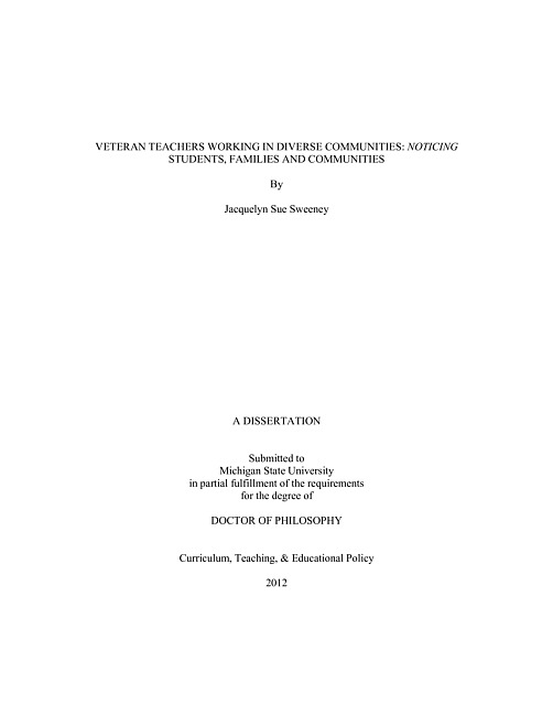 VETERAN TEACHERS WORKING IN DIVERSE COMMUNITIES: NOTICING STUDENTS, FAMILIES AND COMMUNITIESBy Jacquelyn Sue Sweeney Entering schools where cultural, linguistic and socioeconomic diversity exists might hold challenges for the teachers who work there. There is much to glean as teachers not only begin to figure out how to connect the curriculum with students' worlds, but also begin to make connections with students and families who may come from and live in very different settings from their own. Using a sociocultural lens, this study initially examines the artifacts provided by 12 teachers who taught within two school districts serving a high percentage of students receiving free or reduced lunch as well as high numbers of English language learners. Together, their combined time teaching in schools represented nearly 100 years and they teach in either elementary, middle, or high schools. The study then focuses more prominently on 5 of the 12 teachers who agreed to provide more in-depth information through interviews. The teachers in this study were members of a graduate class preparing them for ESL endorsement. The results of their participation in this research shed light on the extent to which they noticed and attended to students and families. Noticing (van Es, 2011, 2008), within a sociocultural perspective, is the framework used most prominently in this work with a strong focus on teaching in high poverty settings. The first data chapter indicates how all of the teachers observed and reacted to the communities in which they taught as they shared their thoughts through a blog. In the remaining data chapters, five teachers were the focus. Their life histories are explored as well as their ideas regarding their work with families, students within diverse school settings. Findings suggest there are varied complexities of teaching in diverse schools and that much work is needed to develop more tangible ways in which to assist teachers in these settings. This may include rethinking the ways in which teacher education programs and professional development courses guide teachers. One of the participants noted that her coursework and professional development assisted her in noting the challenges of students and families in her school but no one had shown her solutions to those challenges. It also might be valuable to include ways that teachers might closely examine their life stories and investigate how those stories interact with those of their students and students' families. Finally, teachers may benefit from resources that include time for peer collaboration, as well as sharing in school decision making that might lead to greater teacher agency.