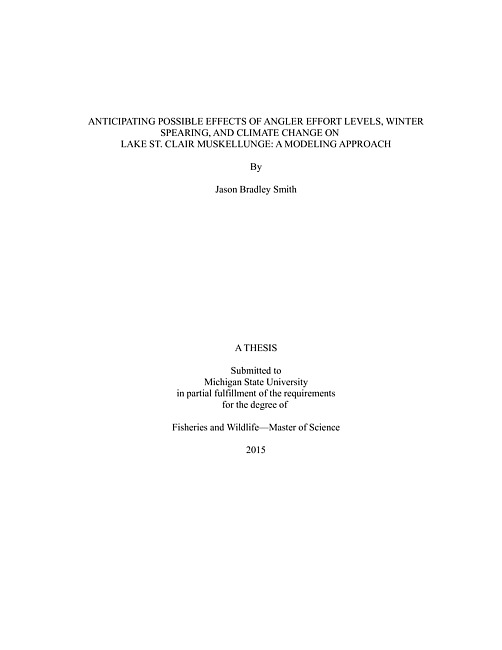 ANTICIPATING POSSIBLE EFFECTS OF ANGLER EFFORT LEVELS, WINTER SPEARING, AND CLIMATE CHANGE ON LAKE ST. CLAIR MUSKELLUNGE: A MODELING APPROACHByJason Bradley SmithThe current Lake St Clair Great Lakes Muskellunge (Esox masquinongy) (LSCM) fishery is entirely self-sustaining and dominated by a catch and release ethic. Catch rates of LSCM are among the highest of any waterbody, and "trophy fish" are relatively commonplace. The proximity of Lake St Clair to a large number of potential new Muskellunge anglers, angler interest in a winter spear fishery, and warming temperatures associated with climate change pose potential risks to the quality of this fishery. We developed an age-structured equilibrium yield model to predict the likely effects of increased angling effort, establishment of a winter spearing season, or warming temperatures on open-water catch rates of three size classes of LSCM (All fish, Legal fish > 42", Trophy fish > 50"). Our modeling indicated that the current high rate of voluntary release would largely buffer catch rates of all size classes of LSCM from substantial negative effects due to forseeable levels of increased fishing effort. Similarly, our simulation of a winter spearing fishery indicated that only high levels of spearing effort and harvest would negatively affect open-water catch rates to a degree that would be objectionable to anglers. However, the predicted catch rates of Legal and Trophy fish were highly sensitive to modeled reductions in growth due to climate warming. While our model predicts the LSCM fishery to be fairly insensitive to even substantial changes in angling effort and spearing harvest, possible effects of warming, which are difficult for fisheries managers to mitigate, could be significant.