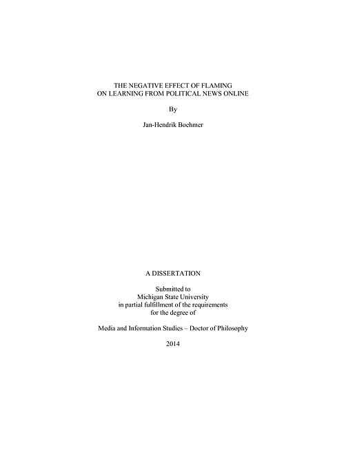 There is much debate among media professionals and academics concerning the role of interactive online media in the education of citizens about current political events. Generally, the media provide information about current events that can be used by individuals to make informed decisions in a democracy. Providing individuals with the opportunity to comment on news articles might aid this process by facilitating elaboration on the topic through online discussions, which has been causally linked to subsequent acquisition of knowledge. To test whether this is true, the present dissertation first tests if elaboration in fact predicts the amount of knowledge individuals acquire from a news article, and whether the availability of comments predicts elaboration.The same online discussions, however, have also been linked to a polarization of viewpoints and the demise of conversations that potentially facilitate elaboration. One common characteristic of online comments that is said to be particularly disruptive is flaming. Flaming is the expression of hostility toward others in online communication and has been found to exert a negative influence on a variety of user perceptions and behaviors. The present dissertation investigates whether flaming affects the amount and quality of knowledge individuals acquire from the news they are exposed to by means of elaboration. In addition, this dissertation investigates if specific design features of online commenting sections, such as tools signaling a commenter's credibility as well as political ideology, also affect elaboration. Finally, this dissertation assesses how credibility and political ideology interact with flaming when it comes to elaboration. It is the goal of this dissertation to contribute to the literature on the consumption of and knowledge acquisition from political news online and provide news organizations with guidelines for the design of interactive news sites. To achieve this goal, two online experiments (n=312) were conducted in which participants were exposed to different online commenting scenarios and then tested on how much knowledge they acquired from the related news articles. OLS regression models and t-tests were used to determine the nature of the effects of flaming, credibility and political ideology on elaboration. Overall, the present data support a causal link between elaboration and knowledge for two of the three tested dimensions and show that flaming had a negative effect on perceptions of news credibility and elaboration. The availability of comments in general did not have a statistically significant effect on elaboration. Only when comments exhibit very specific characteristics, their availability leads to an increase in elaboration. This is not only true when individuals engage in those discussions, but also when they merely see them. Furthermore, the effect of flaming on elaboration is fully mediated by perceptions about the trustworthiness dimension of credibility of the commenters. Whether the political ideology of a commenter matches the political ideology of the reader does not play a significant role. Together the results of the present dissertation shed light on the benefits and drawbacks of online comments and further emphasize the importance of finding new ways to keep online discussions civil.