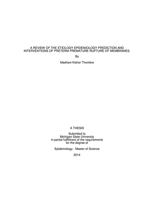 ABSTRACT A REVIEW OF THE ETIOLOGY EPIDEMIOLOGY PREDICTION AND INTERVENTIONS OF PRETERM PREMATURE RUPTURE OF MEMBRANES. ByMadhavi Kishor ThombrePreterm premature rupture of membranes (PPROM) is a clinical subtype of preterm delivery (PTD) with multi factorial etiology and itself a determinant of preterm delivery. Challenges in study of PPROM include variable case definition, outcome misclassification due to inaccurate identification of the initiating event, heterogeneity of pathways leading to PPROM and inconsistent evidence in assessing risk factors. Neonatal outcomes following preterm premature rupture of membranes vary depending on gestational age and latency. Preterm premature rupture of membranes has been described as a complex auto toxic condition and its pathogenesis involves the activation and interaction of the cytokines, matrix metalloproteinases and the apoptosis pathways. Genetic variation and behavioral and environmental risk factors can add complexities to understanding these pathways. PPROM is the strongest predictor of preterm delivery but PPROM prediction has been a challenging issue. A combination of factors, short cervix, previous preterm delivery due to PPROM, and presence of fetal fibronectin seem to be the strongest predictors of PPROM at less than 37 and less than 35 weeks gestation. Intra amniotic infection as indicated by elevated cytokine levels in vaginal fluids also seems to predict PPROM with good sensitivity and modest specificity. Interventional studies to prevent PPROM in have largely been unsuccessful; specifically antibiotic trials in women with bacterial vaginosis have not yielded satisfactory results.