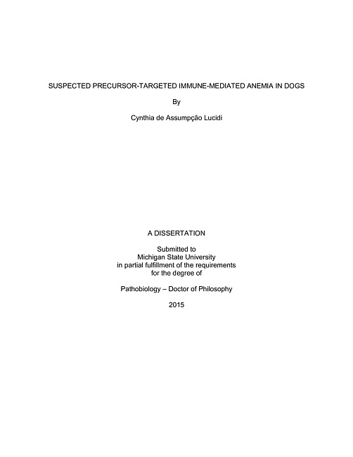 ABSTRACTSUSPECTED PRECURSOR-TARGETED IMMUNE-MEDIATED ANEMIA IN DOGSByCynthia de Assumpção LucidiImmune-mediated hemolytic anemia (IMHA) results in regenerative anemia and is the most well studied immune-mediated anemia in dogs. However, the underlying cause of IMHA remains unknown, and mortality remains a problem. In a different condition, dogs with suspected precursor-targeted immune-mediated anemia (PIMA) present with nonregenerative anemia and ineffective erythropoiesis, which have occasionally been associated with phagocytosis of erythroid precursors (rubriphagocytosis) or myelofibrosis. The pathogenesis of PIMA has not yet been determined, but roles for immunoglobulin and/or complement have been suspected. Additional involvement of apoptosis-like mechanisms with phosphatidylserine (PS) exposure is possible in both canine IMHA and PIMA based on previous studies in people and dogs. Our central hypothesis is that PIMA is part of a spectrum of immune-mediated anemias including IMHA, in which IgG, with or without the contribution of phosphatidylserine (PS), target and promote phagocytosis of different stages of erythroid cells, simultaneously or independently. The rationale was that better characterizing the pathogenesis of PIMA and its association with IMHA will ultimately help establish diagnostic criteria, identify appropriate therapeutic strategies based on knowledge of the pathogenesis of the diseases, and raise veterinary awareness of PIMA. This dissertation first describes a retrospective study of dogs with PIMA with the main goal of helping characterize canine PIMA and facilitate its recognition and diagnosis. Then it describes the development of flow cytometric assays for RBC and erythroid precursor IgG, including a Percoll gradient separation for erythroid populations. These methods were used for isolation of erythroid populations and their assessment for IgG and PS in IMHA and PIMA dogs, healthy dogs, and sick dogs with no evidence of IMHA or PIMA. We found that IMHA dogs had significantly higher IgG and PS when compared to healthy and non-IMHA dogs. Additionally, we showed that a subset of PIMA dogs had increased IgG-positive erythroid precursors when compared to healthy and non-IMHA dogs, and erythroid precursors from most tested PIMA dogs had more PS-positive erythroid precursors than healthy dogs; however, no sick dogs without PIMA were tested for comparison. These findings suggest a role for IgG in canine PIMA and for PS in canine IMHA and PIMA. Finally, we demonstrated the expression of DEA1.1 on canine erythroid precursors from rubriblasts through metarubricytes.