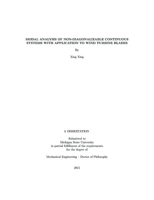 This work represents an investigation of the modal analysis of distributed parameter systems whose stiffness or damping terms are non-diagonalizable with an undamped modal-coordinate transformation. The non-diagonalizability may be caused by nonmodal damping or stiffness that includes parametric excitation. The modal properties for these kinds of problems will be investigated.An approach for analyzing the complex modes of continuous systems with nonmodal damping is first developed. As an example, a cantilevered beam with damping at the free end is studied. Assumed modes are applied to discretize the eigenvalue problem in state-variable form, to then obtain estimates of the natural frequencies and state-variable modal vectors. The finite-element method is also used to get the mass, stiffness, and damping matrices for the state-variable eigenvalue problem. A comparison between the complex modes and eigenvalues obtained from the assumed-mode analysis and the finite-element analysis shows that the methods produce consistent results. The assumed-mode method is then used to study the effects of the end-damping coefficient on the estimated normal modes and modal damping. Most modes remain underdamped regardless of the end-damping coefficient. There is an optimal end-damping coefficient for vibration decay, which correlates with the maximum modal nonsynchronicity.As an experimental example of a non-modally damped continuous system, an end-damped cantilevered beam is studied for its complex modal behavior. An eddy-current damper is applied considering its noncontact and linear properties. The state-variable modal decomposition method (SVMD) is applied to extract the modes from impact responses. Characteristics of the mode shapes and modal damping are examined for various values of the damping coefficient. The eigenvalues and mode shapes obtained from the experiments are consistent with the numerical analysis of the model, although there is variation relative to sampling parameters. Over the range of damping coefficients studied in the experiments, we observe a maximum damping ratio in the lowest underdamped mode, which correlates with the maximum modal nonsynchronicity. The vibration model of a horizontal-axis wind turbine blade can be approximated as a rotating pretwisted nonsymmetric beam, with damping and gravitational and aeroelastic loading. The out-of-plane (flapwise) and in-plane (edgewise) motion of a wind turbine blade are examined with simple aeroelastic damping effects. Hamilton's principle is applied to derive the in-plane and out-of-plane equations of motion, and the partial differential equation is linearized and then discretized by the assumed-mode method. A simple quasi-steady blade-element airfoil theory is applied to obtain the aeroelastic damping. The analysis is performed on three blades of different size. The effects of nonproportional damping are not strong, but are seen to become more significant as the blade size increases. The results provide some experience for the validity of making modal damping assumptions in blade analyses. A perturbation approach is developed to analyze the perturbation effect of the parametric excitation on the unperturbed linear modes. The method is applied in the examples of a three-mass system and a wind turbine blade. In wind-turbine blades, the parametric excitation has a weak effect on the non-resonant unperturbed linear modal responses.