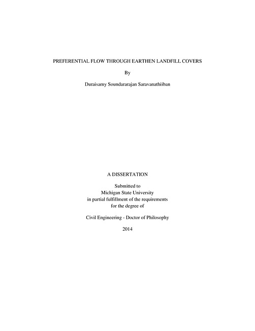 In order to minimize infiltration of precipitation into the waste, final covers are constructed once a landfill reaches its capacity. In and to sub-humid climates, earthen final covers have been permitted. However, formation of macropores (or shrinkage cracks) and flow through relatively large pores can significantly increase percolation through earthen landfill covers during service. Most commonly used water balance models that are used for predicting percolation through earthen cover are based on Richards' equation that simulates only the micropore flow. Hence, a model that can simulate the micropore and macropore flow is required to simulate the long-term hydrology of earthen covers. In this study, validation of Root Zone Water Quality Model (RZWQM) using data collected form an instrumented field-scale test section and development of a model capable of simulating macropore flow using lattice Boltzmann method were carried out.An instrumented field-scale test section of an earthen landfill cover, made up of 1.5 m thick compacted clay overlain by 0.3 m thick topsoil, was constructed at a landfill located in Detroit, MI and monitored for about four years. Measured annual percolation increased by an order of magnitude during the second and the third year of service. Controlled irrigation tests conducted on the test section confirmed macropore dominated flow through the test section. Estimated effective field hydraulic conductivities of the test section increased by an order of magnitude during the 4th year of service compare to the 1st year of service. Field methane tracer tests confirmed the presence and locations of macropores.Water balance of the field test section was simulated using the model RZWQM and a commonly used numerical model UNSAT-H. For the first year data, both models simulated percolation relatively accurately. However, the numerical predictions of percolation were not accurate for the second and the third year when the effect of macropores was ignored. The macropore parameters required for RZWQM were calibrated using field irrigation test results. RZWQM predictions using calibrated macropore parameters yielded relatively accurate prediction of percolation for the second and the third years of the field data. Measurement of macropore flow through clay in lab-scale samples is relatively challenging due to the effect of confining walls and the relatively small size of the sample. A new laboratory technique was developed to consistently fabricate clay samples containing macropores. High resolution X-ray CT images of compacted clay specimens were taken to visualize the 3D structure of macropores. A 3D lattice Boltzmann model (LBM) that can simulate saturated flow through micropore and macropore flow was developed. Verification of the LBM was carried out using analytical solutions. The LBM was validated using laboratory measurement of saturated hydraulic conductivities (ksat) of compacted clay specimens containing macropores. A prediction equation is formulated to predict the rate of flow of an arbitrary shape and tortuous macropore using the flow rate of straight vertical cylinder. The predicted ksat using the proposed formulation and calculated ksat using the LBM matched very well.