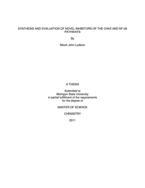 ABSTRACTSYNTHESIS AND EVALUATION OF NOVEL INHIBITORS OF THE CHK2 AND NF-κB PATHWAYSByMicah LudererThe first chapter of this thesis describes synthetic efforts towards novel checkpoint kinase II inhibitors (Chk2). Inhibitors of Chk2 have the potential to protect healthy cells during ionizing radiation treatments by preventing the activation of p53, a cellular apoptotic pathway. Previously our group reported the synthesis of indoloazepine, a hymenialdisine derived natural product. Indoloazepine was found to be a more potent inhibitor of Chk2 compared to the natural product hymenialdisine. The main goal within this thesis was developing a synthesis for the constitutional isomer, iso-indoloazepine. Compared to indoloazepine, the inverted indole ring of iso-indoloazepine was believed to be capable of making an additional hydrogen bond to Glu-308 in the binding pocket of Chk2. Iso-indoloazepine and other analogs have been found to be selective inhibitors of Chk2. The second chapter of this thesis describes synthetic work to further our understanding of how imidazolines inhibit the proteasome. Primarily, synthetic efforts were directed to resolve several racemic imidazolines into their individual enantiomers. This synthetic work was aimed to elucidate enantioselectivity of the proteasome.