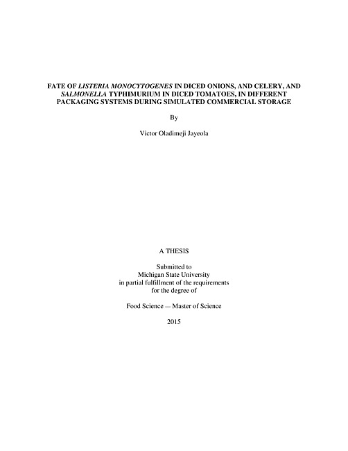 ABSTRACTFATE OF LISTERIA MONOCYTOGENES IN DICED ONIONS, AND CELERY, AND SALMONELLA TYPHIMURIUM IN DICED TOMATOES, IN DIFFERENT PACKAGINGSYSTEMS DURING SIMULATED COMMERCIAL STORAGEByVICTOR O. JAYEOLATemperature is arguably the most important factor affecting microbial proliferation in fresh-cut produce. In this study, the growth responses of Listeria Monocytogenes in diced onions and celery, and Salmonella Typhimurium in diced tomatoes in modified atmosphere packages and snap-fit containers were examined using three fluctuating time/temperature scenarios for transport, retail storage and display. As expected, L. monocytogenes growth in diced onions and celery varied depending on the extent of temperature abuse, with the products stored under the profiles with the highest and intermediate temperature abuse showing significant growth (P < 0.05) in all packages. Salmonella Typhimurium did not show any significant growth in diced tomatoes under the three temperature conditions considered in this study, regardless of the packaging systems. Overall, diced produce in high oxygen atmosphere showed reduced growth compared to other packaging systems. The primary growth parameters for L. monocytogenes in diced onions, and celery were estimate at 12, 16, and 23o C using the Baranyi growth model. The maximum growth rates for L. monocytogenes in both products were highest at 23o C, while the populations were highest at 12o C. The Ratkowsky root-square model was used to estimate the secondary growth parameters for L. monocytogenes in both products. Findings from this study will be particularly useful in assessing the risk associated with the consumption of these fresh-cut products.