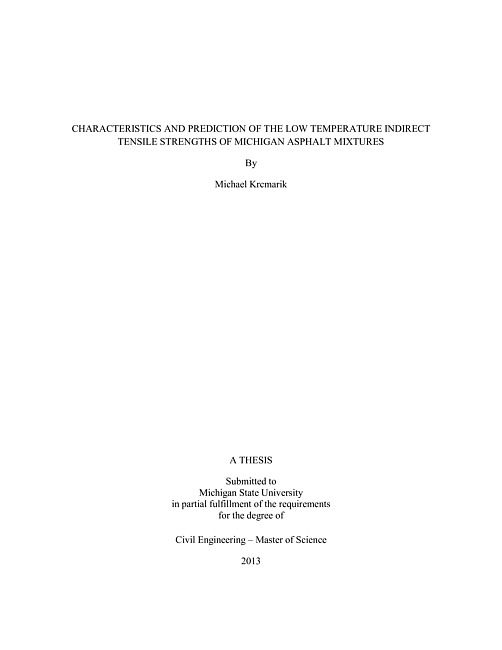 Thermal cracking is the predominant flexible pavement distress in northern climates, causing transverse cracking perpendicular to the direction of traffic. The indirect tensile (IDT) strength test is currently the most widely used method to characterize thermal cracking susceptibility and is an input to the Pavement ME Design software (formerly known as the Mechanistic- Empirical Design Guide (MEPDG). In Pavement ME Design when laboratory IDT strength testing data is not available to designers it is predicted using mixture volumetrics and performance grade (PG) of the binder. The purpose of this research is to examine the IDT strength characteristics of flexible pavement mixtures commonly used by the Michigan Department of Transportation (MDOT) and to develop improved prediction methods for IDT strength. Laboratory testing of 62 unique MDOT mixtures showed Pavement ME Design software generally over predicted IDT strength. Three models where developed to improve the accuracy of IDT strength prediction. The first model consists of local calibration of the current IDT strength Pavement ME Design predictive model for MDOT mixes. The second model consists of a new statistical model developed based on job mix information to predict low temperature IDT strength. The third model consists of an artificial neural network developed to predict low temperature strength from job mix information. All three models showed increased prediction performance when compared to Pavement ME Design IDT strength prediction. With these models a more accurate low temperature prediction of IDT strength is available to pavement designers in Michigan using readily available job mix information.