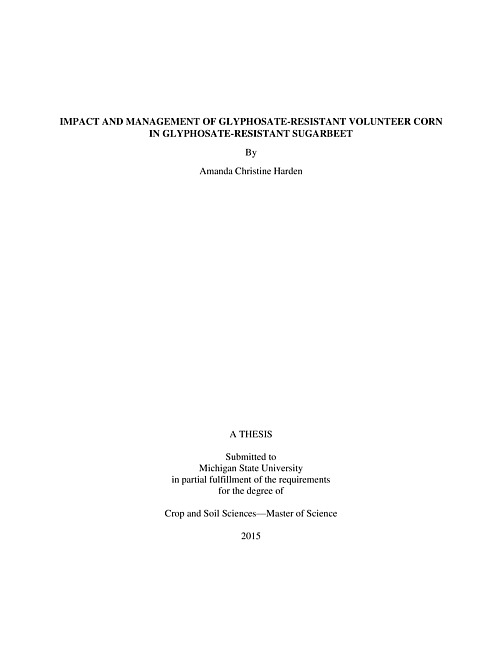 Glyphosate-resistant (GR) volunteer corn is one of the most common weed problems found in GR sugarbeet grown in Michigan. Field trials were conducted in 2012 and 2013 at two locations in Michigan. The objectives were to: 1) quantify the impact of GR volunteer corn on GR sugarbeet yield and quality in wide and narrow rows, and 2) identify the optimal time and herbicide for control of GR volunteer corn. A greenhouse trial was also conducted to determine if early-season competition for nitrogen may be contributing to the sugarbeet yield losses associated with volunteer corn. Volunteer corn biomass was 64%, 19%, and 31% lower in narrow rows than in wide rows when combined over volunteer corn densities at Richville 2012, East Lansing 2013, and Richville 2013, respectively. When data were combined over row width, sugarbeet yield was reduced by an average of 19% and 22.5% when GR volunteer corn competed season-long at a density of 1.72 plants m-2 and 3.44 plants m-2, respectively. Volunteer corn emerging simultaneously with sugarbeet required the earliest control to avoid yield loss. When volunteer corn was not controlled prior to the V4 growth stage, sugarbeet yield was reduced by 10%. Greenhouse research indicated that early-season competition for nitrogen is not likely the primary factor contributing to the suppression of sugarbeet growth and yield by volunteer corn. Clethodim and quizalofop were equally effective at controlling volunteer corn in sugarbeet. Implementing timely volunteer corn control strategies and planting sugarbeet in narrow rows can help alleviate the impact that volunteer corn has on sugarbeet yield and quality.