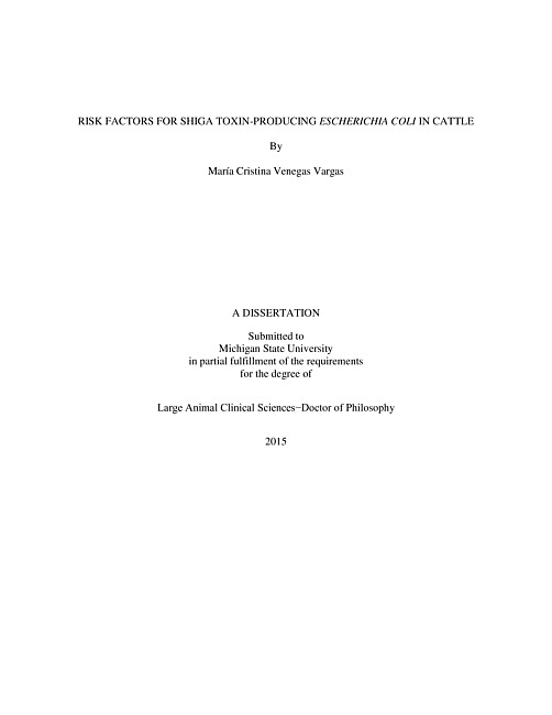 Shiga toxin-producing Escherichia coli (STEC) is one of the most important food borne pathogens of humans globally, having caused numerous outbreaks in North America and worldwide. Severe clinical disease occurs primarily in children and immunocompromised adults and signs range from mild diarrhea to hemorrhagic colitis to Hemolytic Uremic Syndrome, which can result in kidney failure and mortality. Cattle are considered the main reservoir of STEC and food or water contaminated with cattle feces is considered to be a major source of human exposure. Common foods implicated in STEC outbreaks include ground beef, unpasteurized milk, leafy vegetables and apple cider. Other domesticated animals and wildlife can also shed STEC, but their importance as a source of human exposure is considered less significant. Human infections have also been reported following direct and indirect contact with animals at zoos, livestock exhibitions and petting farms. Identifying factors that influence STEC shedding and dynamics in cattle is important for the design and implementation of strategies to prevent STEC transmission. The studies describe in this dissertation are the results obtained from an epidemiological study performed in 11 herds in Mid-Michigan during 2011 and 2012. The primary aims of this project were to identify risk factors for STEC shedding and describe STEC dynamics in cattle. Of specific interest was the potential effect on STEC shedding of pre-existing chronic disease, specifically infection with Bovine Leukemia Virus (BLV) and Mycobacterium avium subsp. paratuberculosis (MAP), the causative agent of Johnes disease. We identified several variables including days in milk and number of lactations, to be important individual factors that influence the risk of STEC shedding in dairy cattle. Intervention strategies could be targeted towards these high risk cattle groups. We also confirmed the importance of seasonality, more specifically warm temperatures, on STEC shedding by cattle. No association was observed between STEC shedding and infection with BLV and MAP. We found a significant association between the independent variable herd and rate of new infections with STEC; also we found a significant association between herd and persistent STEC negative status, both in dairy herds. However, we were not able to identify specific management factors that influence the risk of STEC shedding over time. These finding highlight the complex and multifactorial nature of STEC epidemiology in cattle. Based on the results obtained in this dissertation, we conclude that first lactation cows and cows in their first 30 days of lactation have the highest risk of STEC shedding. As a consequence, these specific groups of cattle can be targeted for the design and implementation of intervention strategies at pre-harvest with the aim of reducing STEC infection in humans.