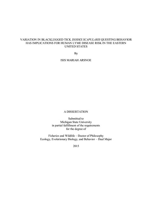 The blacklegged tick, Ixodes scapularis (Acari: Ixodidae), is the vector of Borrelia burgdorferi, the causal agent of Lyme disease (LD) in the eastern United States. Ninety-five per cent of LD cases are reported from the Northeast and upper Midwest, despite the widespread presence of the vector throughout the South. Several hypotheses have been proposed to explain this difference in disease risk. These include geographic variation in large-scale factors such as climatic variables, biodiversity, and tick genetics, which are known and/or believed to influence the abundance of infected ticks in an area. While these factors may explain the ultimate causes of risk variation, they do not reveal the proximate underlying mechanisms maintaining the geographic discrepancy in disease risk. In this dissertation, I propose and demonstrate that a mechanistic factor - the questing behavior of nymphs (the epidemiologically most important life stage of the vector) - is a key factor explaining this gradient in LD risk. I hypothesized that variation in questing behavior is such that nymphs from low LD risk areas (southern regions) rarely host-seek in locations where they come into contact with human hosts, whereas nymphs from high LD risk areas (northern regions) host-seek in locations where human encounters are more likely. I addressed the following specific hypotheses via a 4-year series of field experiments at sites located within the current distribution of I. scapularis:H1: Nymphal I. scapularis host-seeking behavior varies with geographic origin (Chapter 1); H2: Behavioral differences exhibited by nymphs from different geographic origins are maintained when nymphs are translocated to other regions (Chapter 1);H3: The broad geographic variation in human LD risk is strongly correlated with geographic variation in nymphal questing behavior (Chapter 2);H4: The hybrid offspring of I. scapularis from high- and low-risk regions will differ in questing behavior from one or both parental populations (Chapter 3).In Chapter 1, using outdoor experimental behavior arenas placed at four sites in the eastern US, I demonstrate that nymphal blacklegged ticks derived from a LD-endemic (northern) region were 3.6-11.6 times more likely to be observed questing than were nymphs from non-endemic (southern) regions. Furthermore, the observed behavior trends of northern and southern nymphs were consistent in both years and at all sites where they were tested, implicating a genetic component for questing behavior. In Chapter 2, I confirm the generality of the trends observed in Chapter 1 by using the same experimental approach to observe questing behavior of I. scapularis nymphs originating from 15 locations throughout the eastern US. The results of these experiments were consistent with those of Chapter 1; I found that nymphs from LD-endemic regions were much up to 8 times as likely to emerge from underneath the leaf litter versus those from non-endemic regions, regardless of the field site where they were tested. Furthermore, questing behavior was strongly positively related to the LD incidence of the region from which the nymph’s mothers were collected which provides further support for the role of questing behavior and human LD risk. In Chapter 3, I explored potential consequences of I. scapularis range expansion by mating northern and southern tick and found that hybrid ticks behave more like southern nymphs, but with enhanced survival. Future studies on I. scapularis reproductive behavior and biology are necessary to better understanding how local ecology will influence LD risk in areas where northern and southern populations meet.