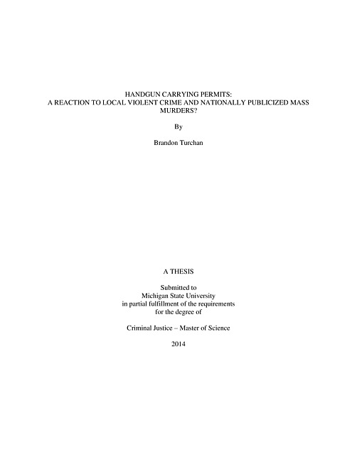 HANDGUN CARRYING PERMITS:A REACTION TO LOCAL VIOLENT CRIME AND NATIONALLY PUBLICIZED MASS MURDERS?ByBrandon TurchanRecently, there has been rapid growth in the number of people applying for handgun carrying permits (HCP). This research investigated monthly HCP application rates at the county-level in Tennessee from 2008 through 2012 to identify possible factors behind the dramatic increase. Two factors hypothesized to be associated with HCP application rates were local violent crime rates and the occurrence of nationally publicized mass murders. First, a concurrent time series design was used to test for a relationship between local rates of murder, robbery, aggravated assault rate, forcible rape, and motor vehicle theft with HCP application rates. A Granger causality test was used to investigate simultaneity between the two key variables. Second, an interrupted time series design tested whether there was a relationship between nationally publicized mass murders and HCP application rates. Local murder, forcible rape, and robbery rates were found to be unrelated to HCP application rates, with mixed results for aggravated assault and motor vehicle theft rates. Also, results were mixed regarding the relationship between nationally publicized mass murders and HCP application rates but evidence suggests that an association may exist. Results are discussed in terms of theory and policy implications.