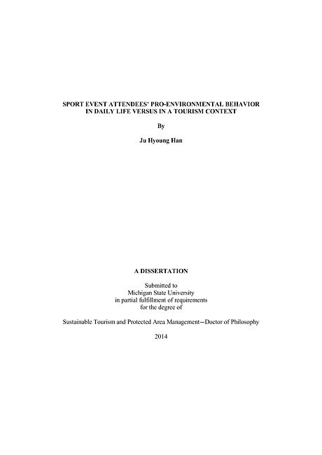 "Collegiate football games in the U.S. are a growing sector of sport event tourism. While these sport events clearly generate positive social and economic benefits, the Environmental Protection Agency estimated that an average college football game produces 50-100 tons of waste and releases 188-376 metric tons of CO 2 . To minimize such negative environmental impacts, universities have implemented campaigns to motivate football fans to engage in pro-environmental behavior. However, it is challenging to mobilize individuals' environmental concerns and transform them into action while they are watching games and participating in tailgating. The discrepancy of pro-environmental behavior in daily life versus in a sport tourism context is poorly understood, as most researchers have focused their studies in one or the other context. By employing goal-framing theory (Lindenberg & Steg, 2007) and the Social Norm Approach (Perkins & Berkowitz, 1986), this study examined whether and how event attendees' pro-environmental behavior in daily life differed from their behavior in the sport event setting... -- Abstract.