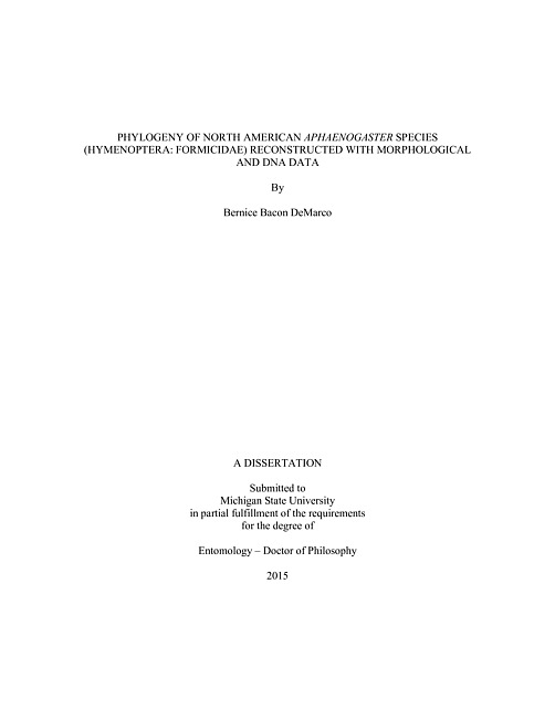 The ant genus Aphaenogaster Mayr is an ecologically diverse group that is common throughout much of North America. Aphaenogaster has a complicated taxonomic history due to variability of taxonomic characters. Novomessor Emery was previously synonymized with Aphaenogaster, which was justified by the partial mesonotal suture observed in A. ensifera Forel. Previous studies using Bayesian phylogenies with molecular data suggest Aphaenogaster is polyphyletic. Convergent evolution and retention of ancestral similarities are two major factors contributing to non-monophyly of Aphaenogaster. Based on 42 multi-state morphological characters and five genes, we found Novomessor more closely related to Veromessor Forel and that this clade is sister to Aphaenogaster. Our results confirm the validity of Novomessor stat. r. as a separate genus and it is resurrected based on the combination of new DNA, morphological, behavioral and ecological data. Twenty-three Aphaenogaster species (Hymenoptera: Formicidae) occur in North America. While morphology and ecology define most species, the species limits of a group in the Eastern United States are unclear. In particular, the morphological and behavioral characters once thought to define A. carolinensis, A. picea and A. rudis do not associate with their hypothesized species limits. These observations suggest that these species are not monophyletic. We therefore tested the monophyly of Aphaenogaster in the context of molecular phylogenetic analyses. We used DNA data from five genes: CO1, CAD, EF1αF2, Long-wavelength Rhodopsin and Wingless to reconstruct phylogenies for 44 Aphaenogaster and outgroup species. In the resulting trees, reconstructed using parsimony and Bayesian inference, species boundaries associate with well-supported monophyletic clades of individuals collected from multiple locations. For example, A. carolinensis was monophyletic and a missing CAD intron was a diagnostic trait for the clade. However, some clades were unresolved, and A. picea and A. rudis were not monophyletic. Given the short branch lengths, these results suggest that these ants have likely recently radiated, and lack of gene lineage sorting explains the non-monophyly of species. Conversely, these results may indicate that clades of multiple species represent fewer but morphologically varied species. Additional biological information concerning pre- and post-mating barriers is needed before a complete revision of species boundaries for Aphaenogaster.Aphaenogaster Mayr 1853, contains 227 species worldwide (Bolton 2006) with 23 valid North American species, several species of which are hard to separate based on morphology alone (Umphrey 1996). The difficulty in identifying some of these species is due to limited diagnostic characters and to the lack of a comprehensive illustrated key. A recent analysis returned three species from Aphaenogaster to Novomessor, thus making Aphaenogaster in North America monophyletic (DeMarco and Cognato 2015). While many species have easily identifiable morphological characters, some east coast species within the A. rudis clade in North America are difficult to differentiate. Two of these species, A. carolinensis and A. miamiana, can be diagnosed using DNA. The gene CAD was missing an intron in those taxa. Four additional taxa, all identified morphologically as A. rudis, were found to be polyphyletic (DeMarco and Cognato, in prep, or see Chapter 2).