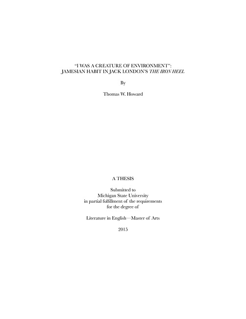 William James describes in his Principles of Psychology the central role that habits and adaptation plays in the human experience. Habits affect an individual’s beliefs, actions, and emotions, and without habits an individual would not have any personality. In the nineteenth century, literary theorists such as Henry James describe the necessity for authors to create realistic characters and events. This thesis displays the intersection of these two intellectual movements in Jack London’s dystopian novel, The Iron Heel. I begin by examining the history of the theory of habits beginning with John Locke and ending with James’s own works on the subject. I then focus on literary theory and the ways it is conducive to the absorption of habit theory into the creation of realistic literary characters. I argue that novels that do this are “psychoepisodic,” or novels containing psychologically realistic characters that describes a piece of the psychological side of the human experience through various episodes. Finally, I use these theories to examine London’s The Iron Heel and the ways London uses habits in the development of the characters.