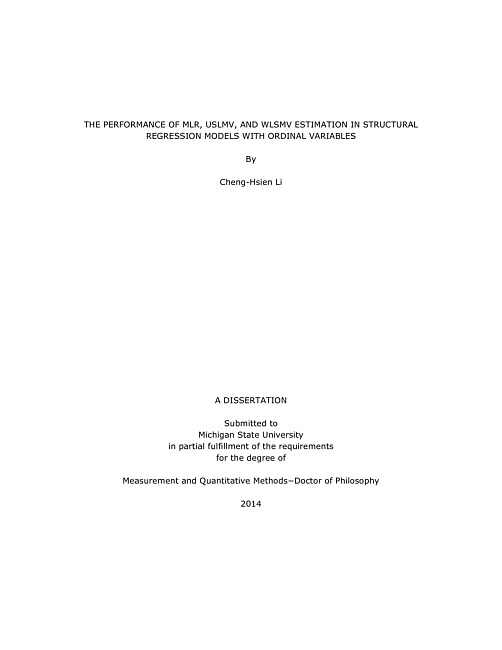 "The purpose of this thesis was to carry out a Monte Carlo simulation study, in order to compare the performance of ML, the most widely known estimation method, with the three robust estimators (MLR, ULSMV, and WLSMV) on parameter estimates, standard errors, and chi-square goodness of fit statistics in a five-factor structural regression model with ordinal observed variables... " -- Abstract.