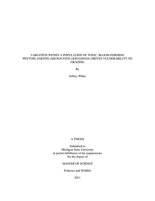 Genetically-based trait variation and size variation within a single population (Gull Lake, Michigan) of the toxic, bloom-forming phytoplanker, Microcystis aeruginosa, are explored as drivers of grazing vulnerability to the invasive zebra mussel (Dreissena polymorpha). Laboratory feeding experiments were used in which preference for M. aeruginosa was assessed relative to a high-quality alga (Ankistrodesmus falcatus). Chapter 1 demonstrates that some M. aeruginosa genotypes from the same population are maximally edible, whereas others are not ingested by mussels. Thus, the range in vulnerability of sympatric M. aeruginosa clones to mussels is equal to that reported across all phytoplankton species. Mussel selectivity was not related to microcystin toxin quota and is most likely driven by variation in expression of a genetically-based factor. In Chapter 2, the mortality rate of M. aeruginosa to 16-21 mm mussels is quantified as a function of colony size. Mussels were fed a single, highly palatable clone in size fractions. Colonies ≥ 111 μm were not consumed, representing a critical size threshold of invulnerability. Smaller colonies and single cells were consumed non-selectively. Field surveys of the Gull Lake M. aeruginosa population revealed that colony size consistently decreases during the summer, from above to less than or equal to the vulnerability threshold, which could allow for major shifts in the overall susceptibility of the population to mussel grazing. Intraspecific variation (genetic and phenotypic) in ecological traits could thus influence the promotion or control of noxious blooms of toxigenic cyanobacteria.