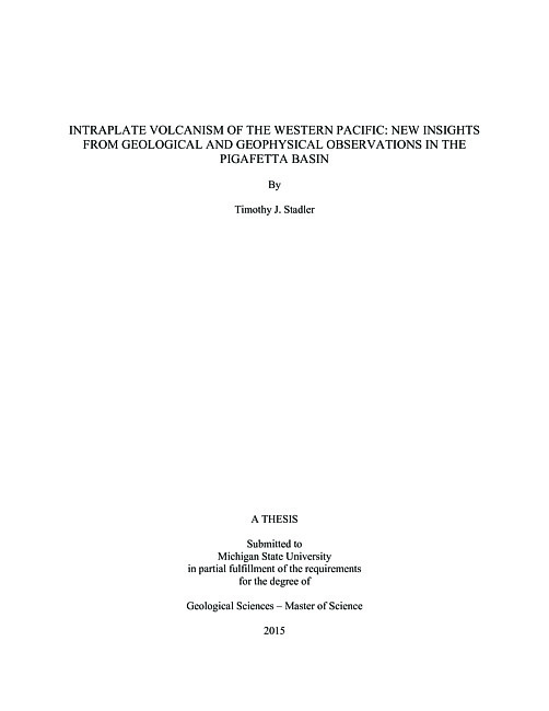 ABSTRACTINTRAPLATE VOLCANISM OF THE WESTERN PACIFIC: NEW INSIGHTS FROM GEOLOGICAL AND GEOPHYSICAL OBSERVATIONS IN THE PIGAFETTA BASINByTimothy J. StadlerUnderstanding intraplate volcanism is a key to deciphering the Earth's magmatic history. One of the largest intraplate volcanic events occurred during the mid Cretaceous, roughly 75 to 125 Ma in the western Pacific. To investigate the origin and effects of this volcanism on various Earth systems, we present the first comprehensive study of volcanism in the Pigafetta Basin using seismic surveys, magnetic and gravity modeling, and Ocean Drilling Program drill core and well log data from Site 801. Our results show that intraplate volcanism in the Pigafetta Basin coincides with the rest of the western Pacific, supporting the plumelets scenario for the origin of intraplate volcanism during the mid Cretaceous volcanic event. We also discover that the late stage volcanism does not overprint the original ocean crust in the Pigafetta Basin, and hence, marine magnetic anomalies recorded in the Jurassic basement are preserved. Also, the formerly identified Rough Smooth Boundary (RSB) is indistinguishable from any other rough-smooth topographic boundaries throughout the survey area suggesting that the RSB is unlikely to be a Cretaceous sill-Jurassic basement boundary. Lastly, the apparent ages and spatial distribution of volcanic features suggests a dynamic history of hydrothermal circulation in the Pigafetta Basin, indicating that hydrothermal circulation was ongoing well past 100 Ma.