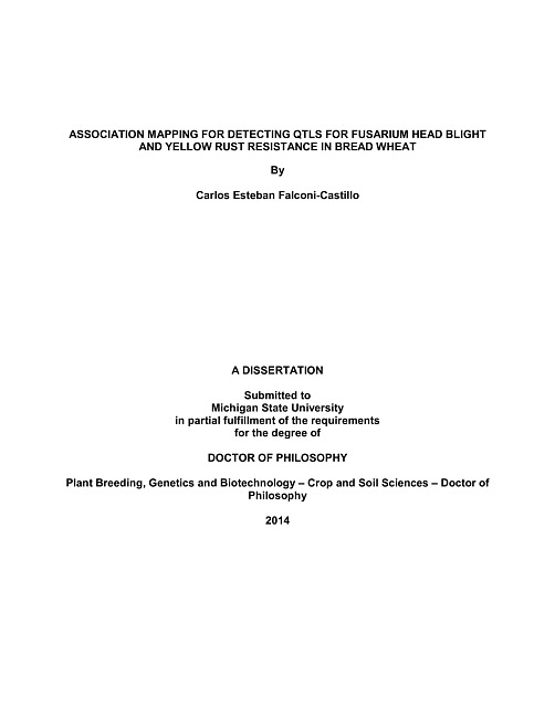 ASSOCIATION MAPPING FOR DETECTING QTLS FOR FUSARIUM HEAD BLIGHT AND YELLOW RUST RESISTANCE IN BREAD WHEATBy: Carlos Esteban Falconi-CastilloYellow rust (YR), caused by Puccinia striiformis, and Fusarium head blight (FHB), caused by Fusarium graminearum, are two of the most important wheat diseases in the world. Both pathogens cause severe losses in yield and in the case of FHB, there is an additional concern related with mycotoxin production, which induces serious toxicological problems in human and animals. Breeding for resistance for both diseases has been considered as the most practical strategy of control. To identify sources of resistance and detect regions responsible of resistance to these diseases in wheat germplasm, an association mapping panel (AMP) of 297 spring wheat lines developed by the International Maize and Wheat Improvement Center (CIMMYT) was assembled. The AMP was evaluated for resistance to P. striiformis and F. graminearum in Mexico and Ecuador over two years. The AMP was screened with 8,632 SNP markers included in the wheat 9K chip from Illumina® and 66 SSR markers from the wheat consensus map. A total of 3,701 SNP and 33 SSR markers were informative and were used to perform analyses in the wheat AMP. Genotypic data was used to estimate the population structure and determine the extent of linkage disequilibrium in the panel. Genotypic and phenotypic data was used to identify marker trait associations.The structure analysis determined that the panel can be separated in three sub-populations. The extent of LD was different for each genome with major differences between linkage groups in the D-genome. Association analysis with GLM method detected significant regions associated with yellow rust resistance on chromosomes 1A, 2A, 5A, 6A, 7A, 2B, 5B, 6B, 7B, and 3D, however, the analysis with the MLM method detected significant regions on chromosomes 1A and 2A. The association analysis conducted for Fusarium head blight resistance using the GLM detected regions significantly associated with resistance on chromosomes 4A, 7A, 2B, 5B, and 7B and using the MLM method the regions associated with resistance were located on chromosomes 2B and 7B. In the association analysis for DON concentration with GLM the regions associated with resistance were detected on chromosomes 4A, 5B, 7B, and 2D. However, no significant regions were detected with the MLM method. This study allowed the identification of several sources of resistance for yellow rust and Fusarium head blight as well as the identification of several molecular markers linked to regions responsible for resistance to these two important diseases. Additionally, the wheat AMP panel showed to be a source of genetic diversity. The findings reported here can be applied to wheat breeding by different programs interested in spring wheat. Finally, the SNP chip utilized to conduct the genotypic analysis was found to be a very useful tool to conduct association analysis studies. However, more coverage on the D-genome might be necessary in spring wheat populations.